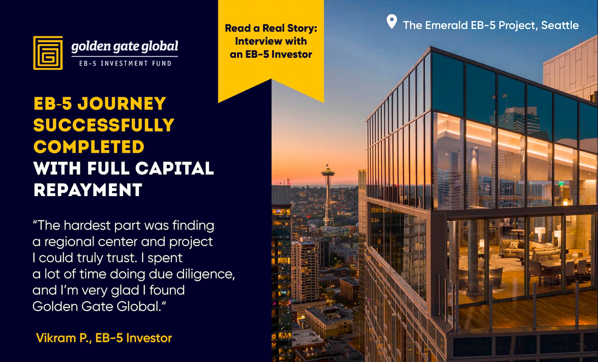 To offer firsthand insight into the EB-5 journey, we sat down with Vikram P., an investor in the Emerald of Seattle project, for a direct conversation. In the Q&A below, he shares his personal experience working with Golden Gate Global, receiving full repayment, and advice for future EB-5 investors.